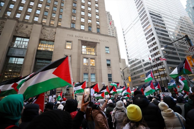 İsrail'in Gazze'ye yönelik saldırılarını protesto eden göstericiler, ellerinde pankart ve Filistin bayrakları taşıyarak Nathan Phillips Meydanı'ndan başlayarak, Toronto şehir merkezinde yürüdü.