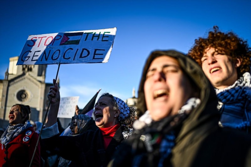 "Şimdi ateşkes", "Gazze'deki soykırımı durdurun" ve "Filistinlilere karşı uluslararası hak ihlallerini durdurun" yazılı dövizler taşıyan göstericiler, "Filistin'e özgürlük" sloganı attı.