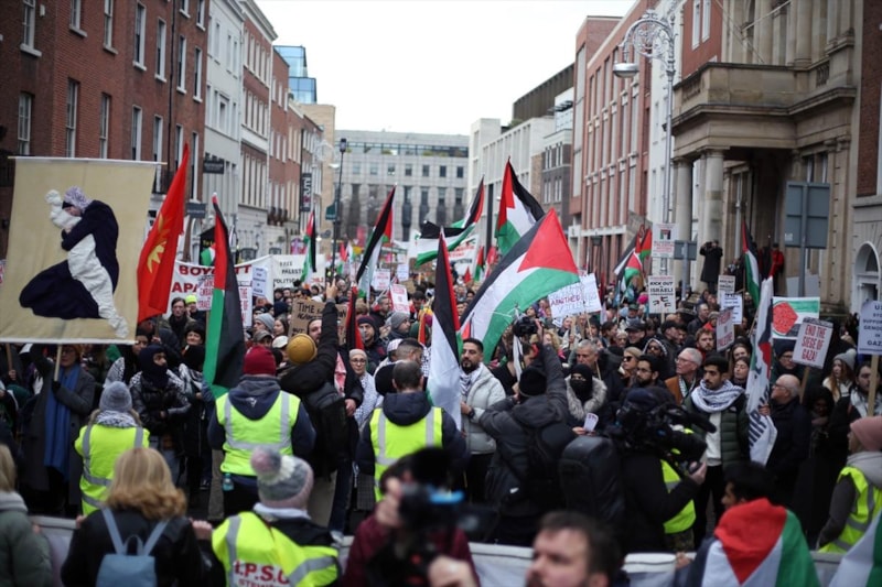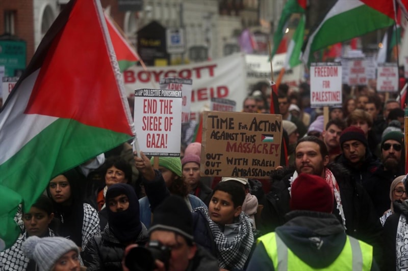 İrlanda'nın başkenti Dublin'de bir arayan gelen göstericiler, İsrail'in Gazze'ye yönelik saldırılarını protesto ederek Filistin halkına destek gösterisi düzenledi.