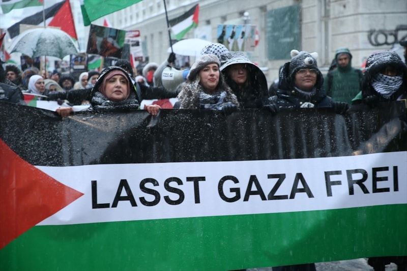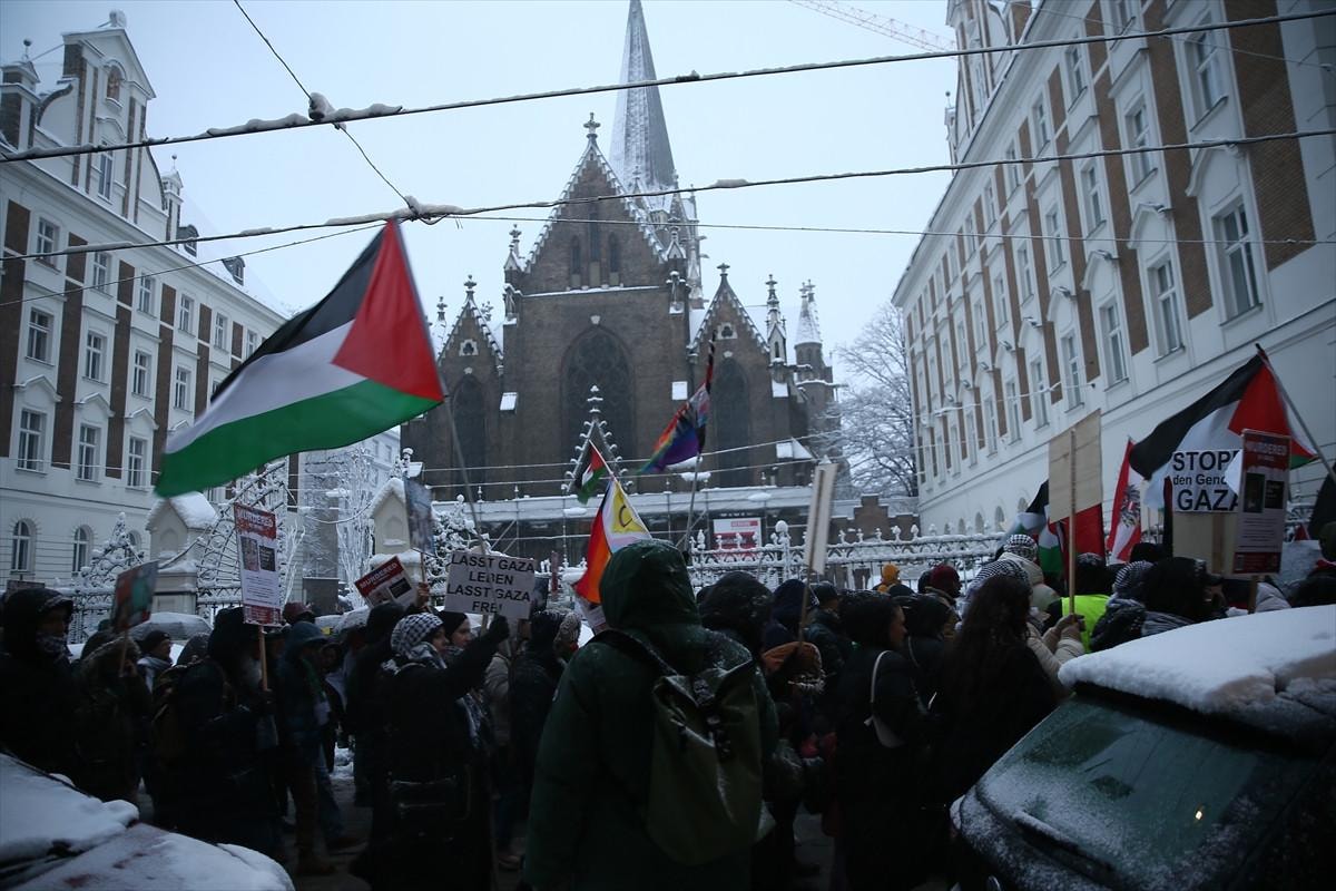 Yoğun kar yağışı ve soğuk havaya rağmen başkentin önemli noktalarından Mariahilfer Strasse'de toplanan göstericiler, Filistin bayraklarının yanı sıra "Gazze'de soykırım dursun", "Hemen ateşkes" ve "Özgür Filistin" yazılı pankartlar taşıdı.