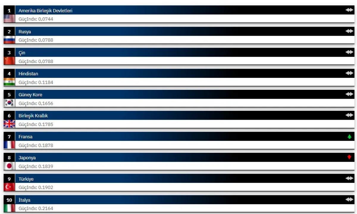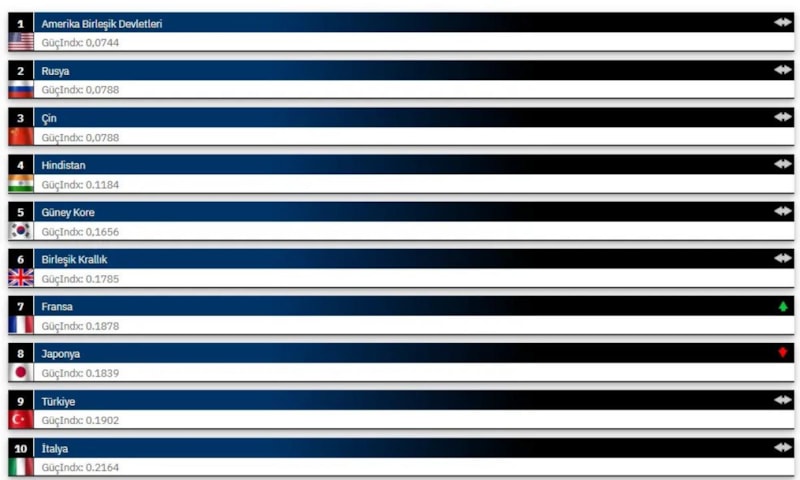 Raporda ülkelerin askeri güçleri, askeri personel sayısı, savunma bütçesi, hava ve deniz gücü, lojistik kapasite ve teknolojik üstünlük gibi 60’tan fazla kriter değerlendirilerek sıralandı.
