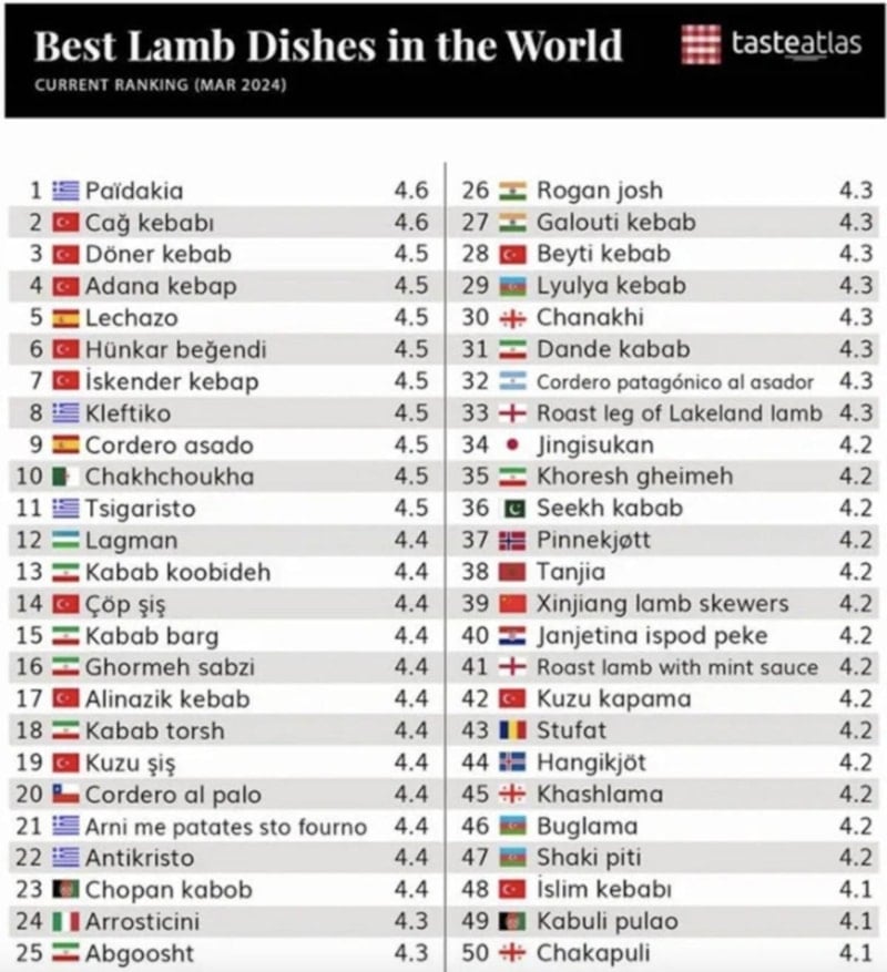 Dünya mutfaklarıyla ilgili yayınları ile dikkat çeken Taste Atlas, dünyanın en iyi kuzu yemekleri sıralamasında ilk sırada Yunan pirzolasına yer verirken listenin devamını Türk lezzetleri doldurdu.