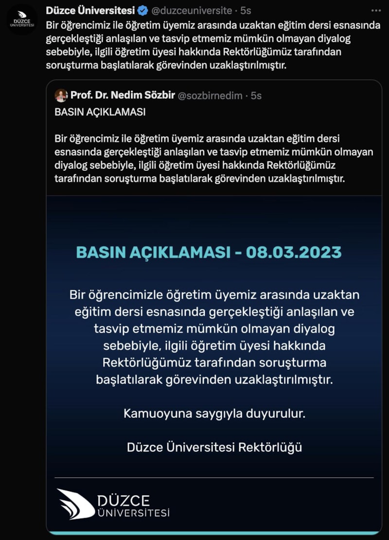 Bir öğrencimiz ile öğretim üyemiz arasında uzaktan eğitim dersi esnasında gerçekleştiği anlaşılan ve tasvip etmemiz mümkün olmayan diyalog sebebiyle ilgili öğretim üyesi hakkında rektörlüğümüz tarafından soruşturma başlatılarak görevinden uzaklaştırılmıştır.