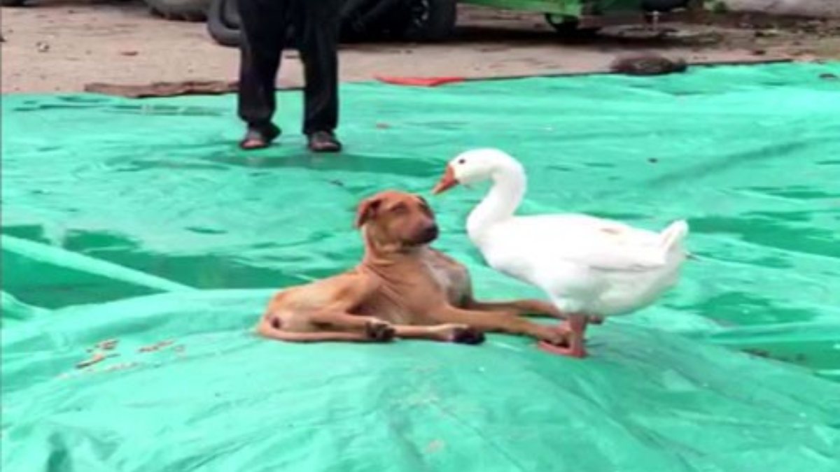 Köpek ve kazın dostluğu görenleri şaşırtıyor VİDEO