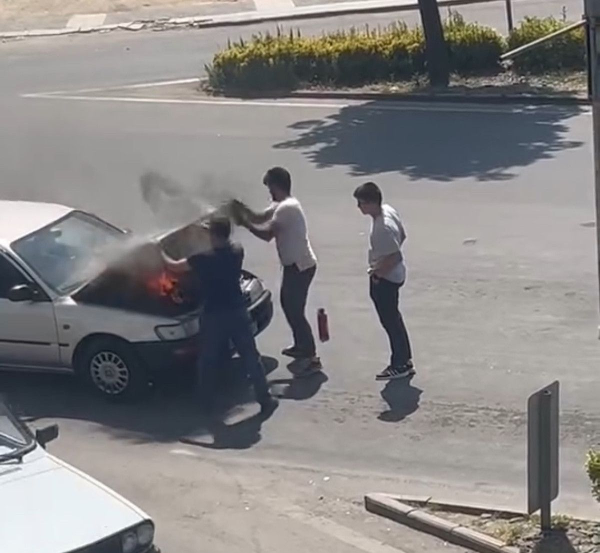 O sırada çevrede bulunan vatandaşlar yangın tüpleriyle alevlere müdahale etti.