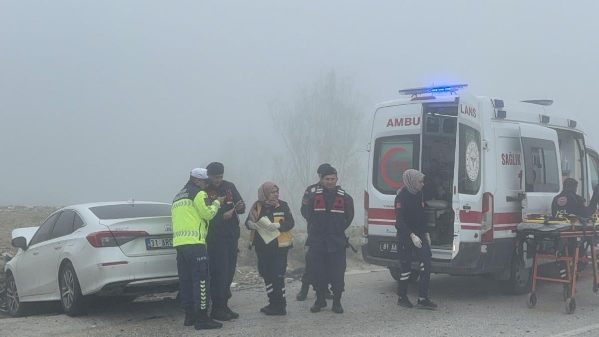 Düzce’de Kurtsuyu Kavşağı’nda seyir haline geçmek isteyen isteyen sürücü, yoğun sis nedeniyle görüş mesafesi azalınca karşıdan gelen araçla kafa kafaya çarpıştı.