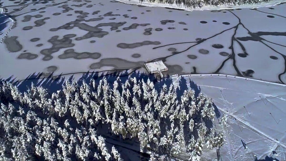 Soğuk havanın etkisiyle ise, yaylada bulunan göletin yüzeyi buza dönüştü.