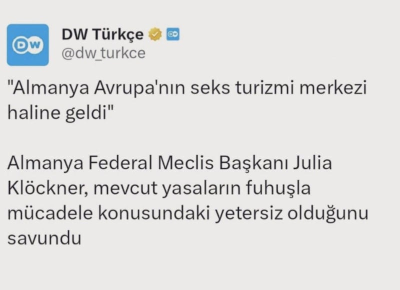 DW Türkçe'nin hesabından yapılan bir paylaşımda, "Almanya Avrupa'nın seks turizmi merkezi haline geldi." ifadesi öne çıkarıldı.