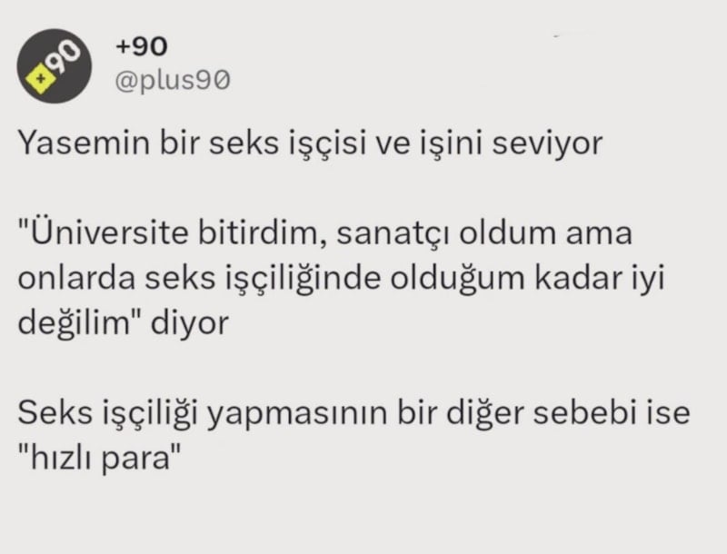 Sahiplerinden biri de DW Türkçe olan +90'dan yapılan paylaşımda ise, "Yasemin bir seks işçisi ve işini seviyor." denildi.