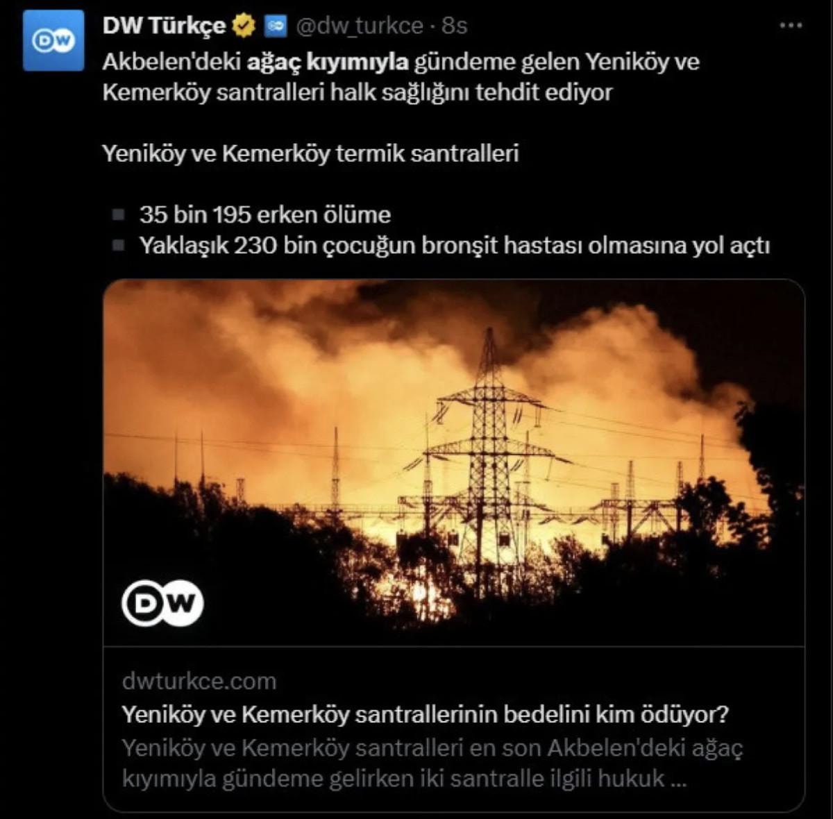 Muğla'nın Milas ilçesinde 1980'den bu yana yerli linyitten elektrik üretilen ve bölge insanının geçim kaynağı olan Yeniköy-Kemerköy Termik Santrali'nin işlettiği Akbelen’deki kömür madeninin çıkarılmasına karşı çıkan malum gruplara katılan DW Türkçe, attığı manşetlerle yine tepkileri toplamıştı.