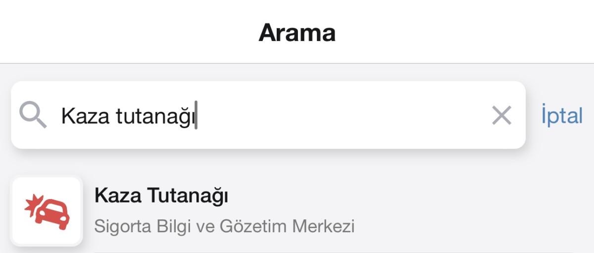 -E-Devlet mobil uygulamasında arama bölümüne “Kaza Tutanağı” yazarak "Sigorta Bilgi ve Gözetim Merkezi" tarafından sunulan "Kaza Tutanağı" hizmetine tıklayın.