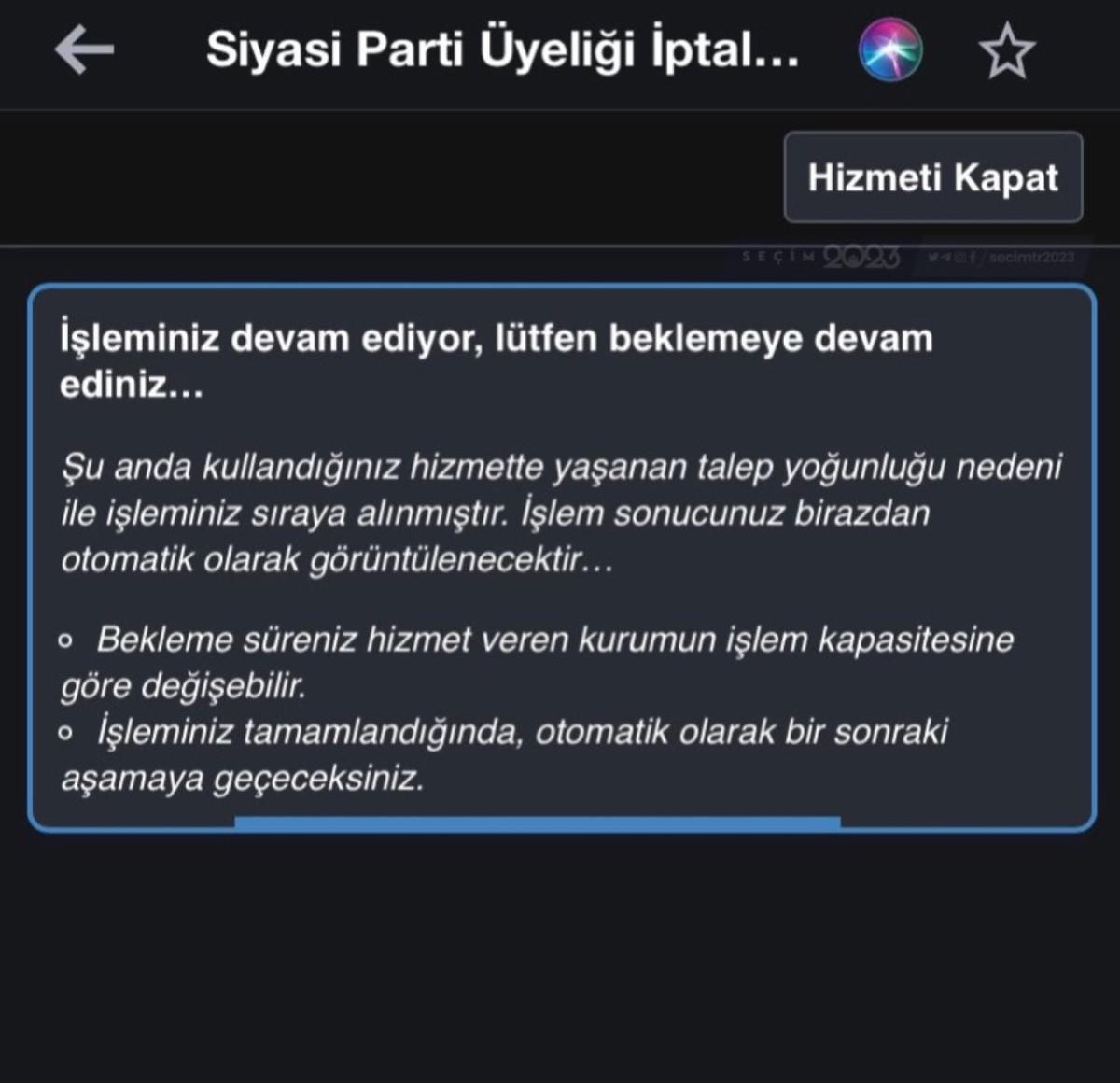 "Siyasi Parti Üyeliği İptal Başvurusu" hizmetinde yoğun talep nedeniyle sorun yaşanıyor..