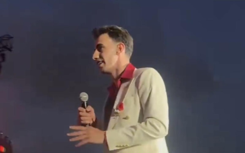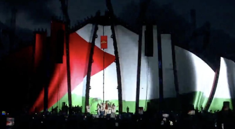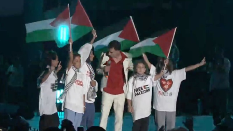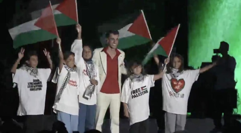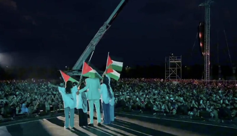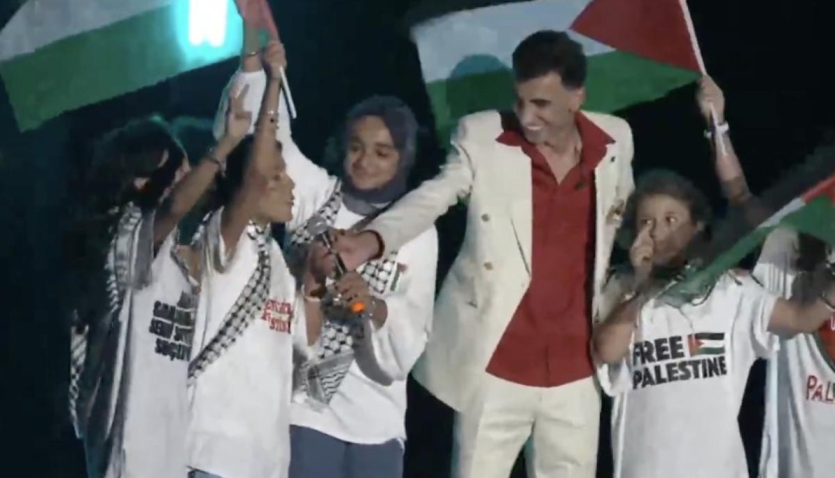 Sahne şovu başlamadan önce büyük ekrana Filistin bayrağı yansıtan Ebo, sahneye çağırdığı minik hayranları ile Filistin bayrağı sallayarak slogan attı.