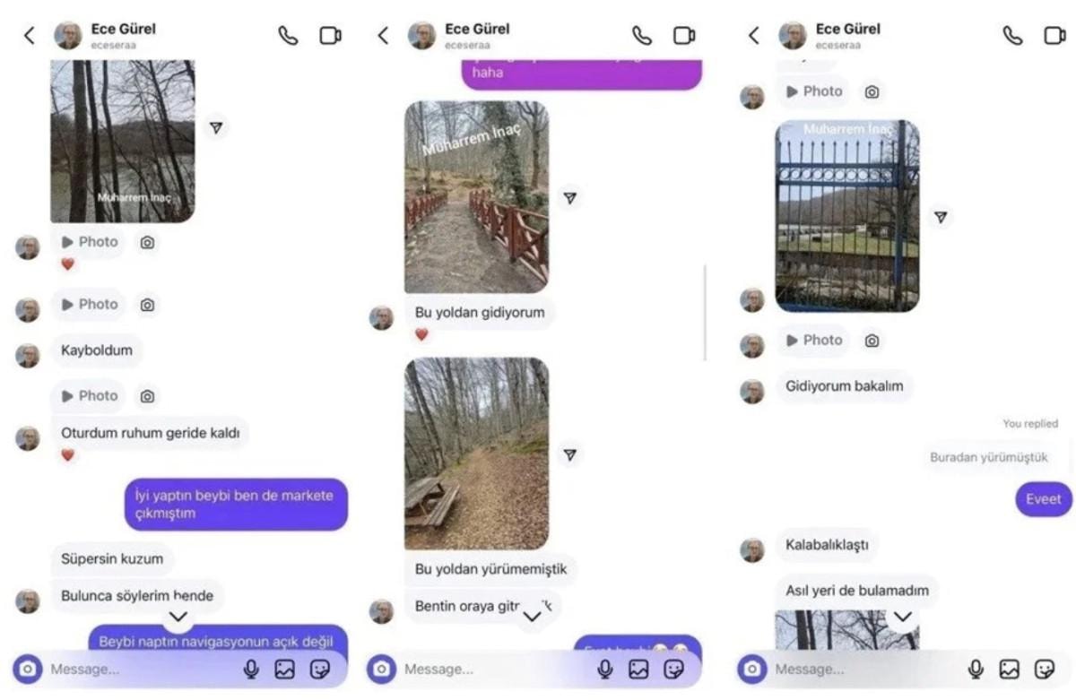 Gürel’in kendisine ilk olarak Atatürk Arboretumu’na gideceğini söylediğini ancak sonrasında karar değiştirdiğini ve Belgrad Ormanı'na gittiğini belirten Özge A.Ö., “Bana ‘Ormana gitmek nefes almak, hava almak istiyorum’ dedi. Orada daha önce birlikte gittiğimiz yerlerden bana fotoğraflar attı.