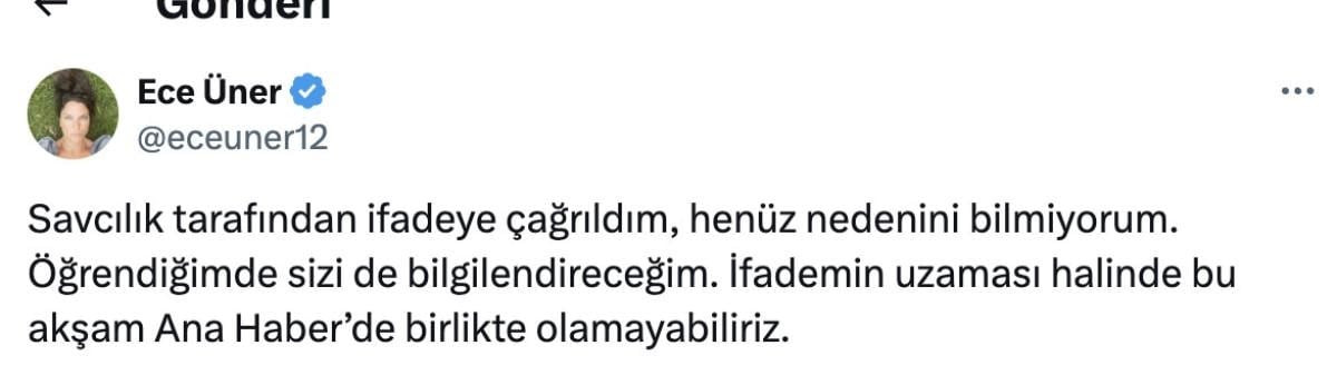 Üner yaptığı açıklamada, "Savcılık tarafından ifadeye çağrıldım, henüz nedenini bilmiyorum. Öğrendiğimde sizi de bilgilendireceğim.