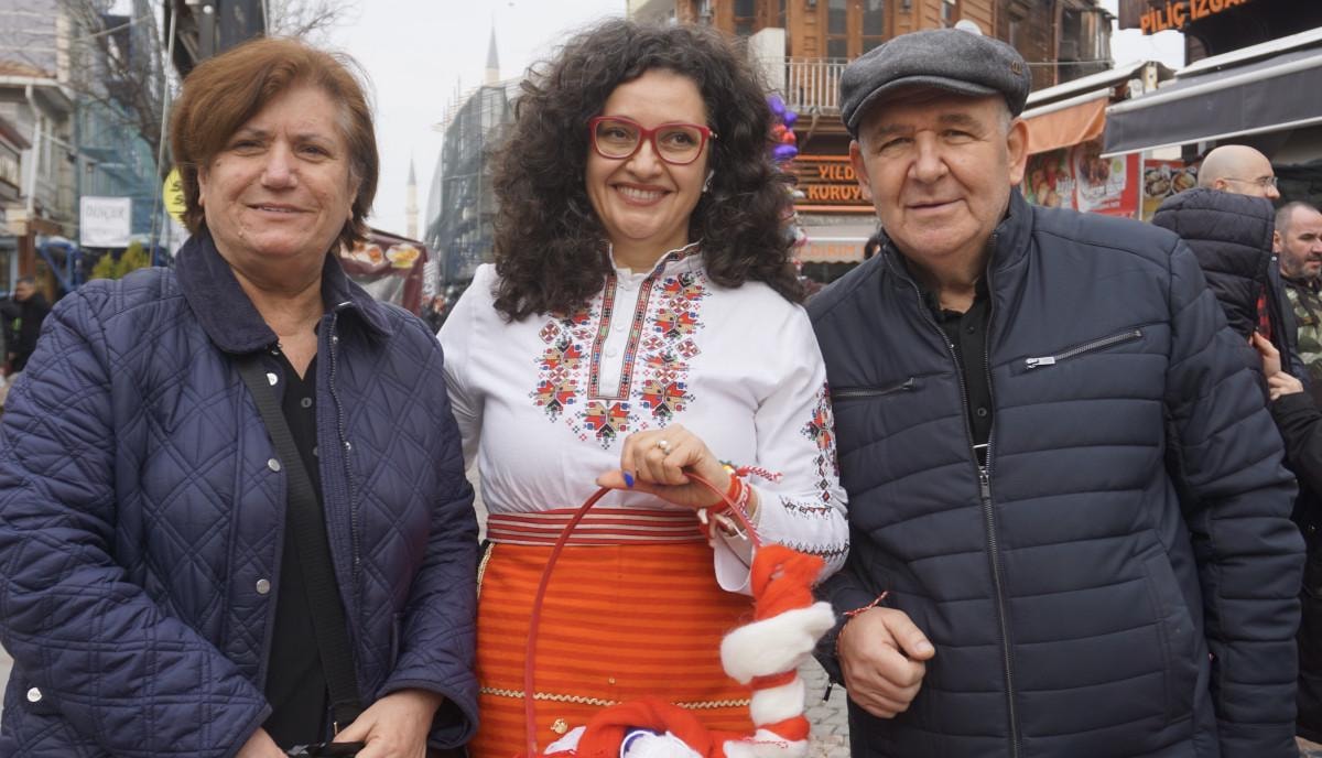 Yöresel kıyafetli konsolosluk görevlileri de kırmızı beyaz yün ip ya da boncukla yapılmış marteniçka bilekliklerinin dağıtım etkinliğinde yer aldı.