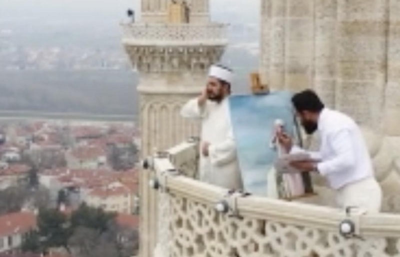 Selimiye Camisi minaresinde ezan okuyan müezzini resmetme isteği olumlu bulunan ressam, şerefeye çıktı.