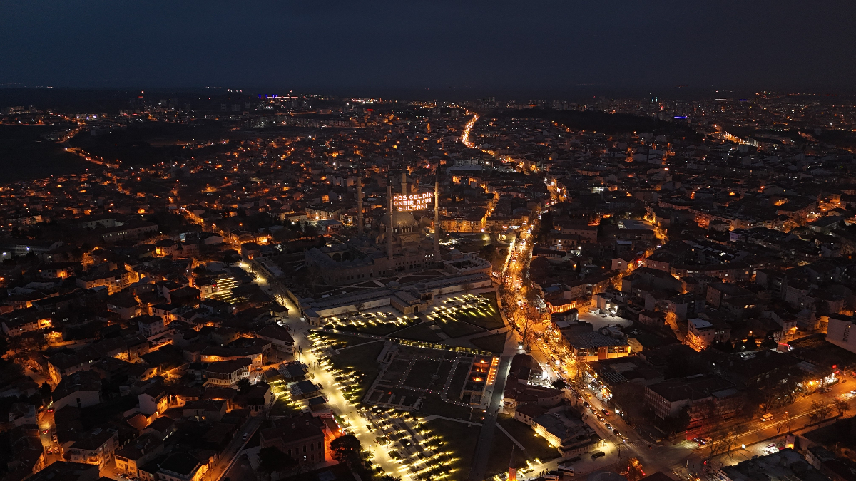 Edirne'de Mimar Sinan'ın şaheseri Selimiye Camisi'nin iki minaresine halatlar ve onlarca ampul ile asılan "Hoş geldin on bir ayın sultanı" yazılı mahya, vatandaşlar tarafından yoğun ilgi görüyor.
