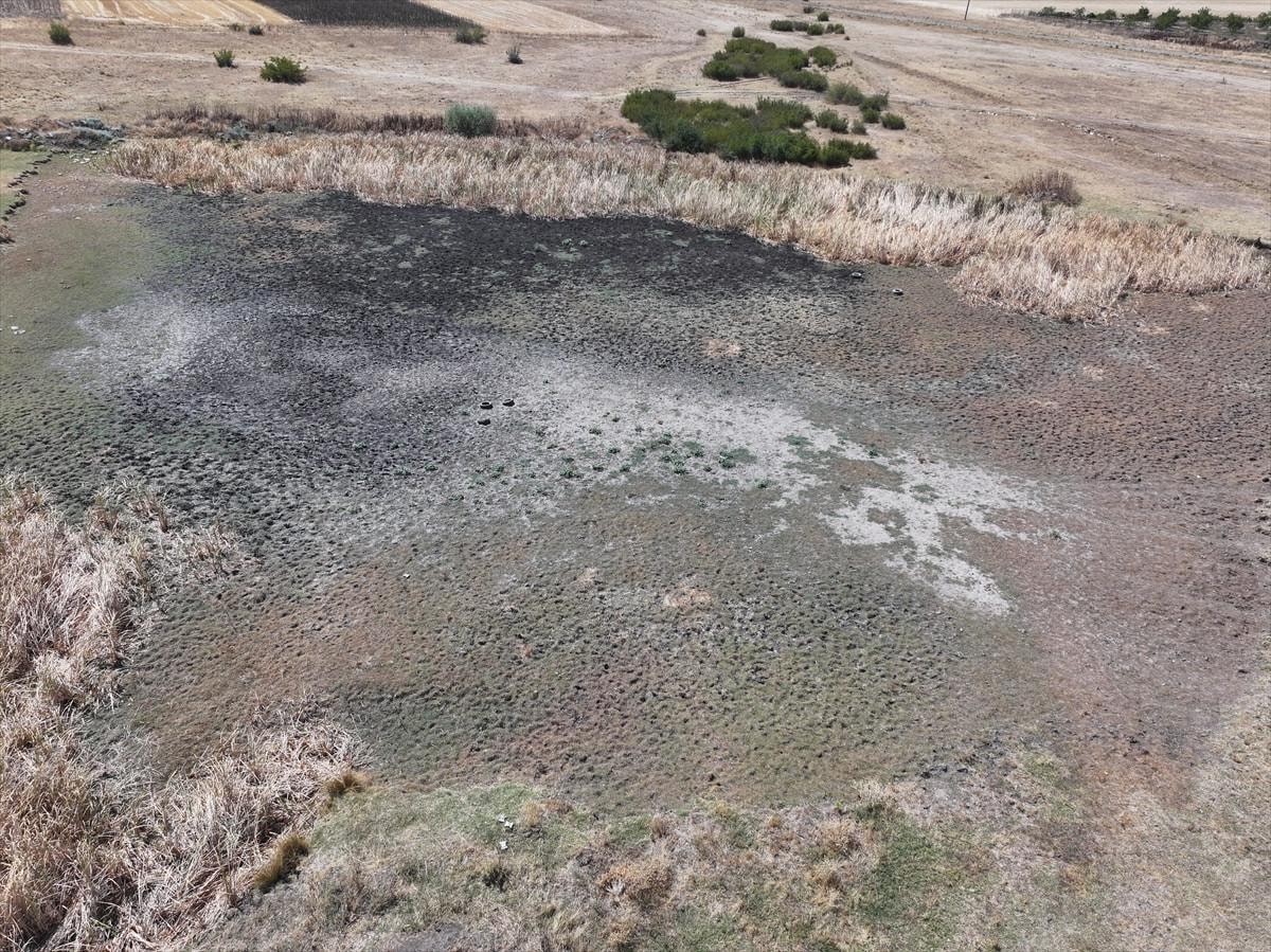 Kuruma nedeniyle göletin tabanında çatlaklar oluştu, bir bölümü sazlıklarla kaplandı.