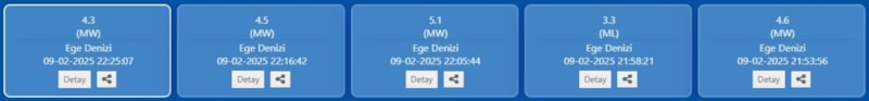 Saat 21.53 ile 22.25 saatleri arasında, merkez üssü Ege Denizi olan 4.6, 3.3, 5.1, 4.5 ve 4.3 büyüklüğünde sarsıntılar meydana geldi.