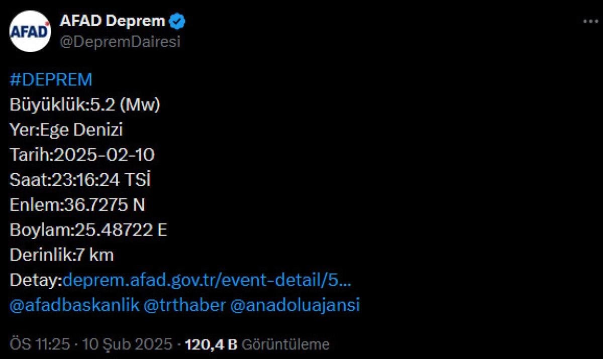 Afet ve Acil Durum Yönetimi Başkanlığı (AFAD) verilerine göre, saat 23.16'da gerçekleşen depremin büyüklüğü 5.2 olarak kaydedildi.