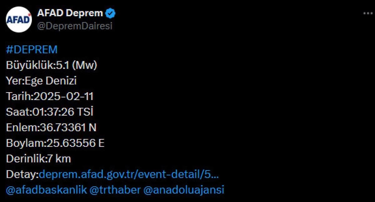Ege Denizi açıklarında yaşanan depremin büyüklüğü 5.1 olarak verildi.