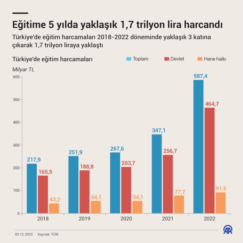 Türkiye'de eğitim harcamaları 2018-2022 döneminde yaklaşık 3 katına çıkarak 1,7 trilyon liraya yaklaştı. En çok harcama ise 102 milyar 499 milyon lira ile ortaöğretim oldu.