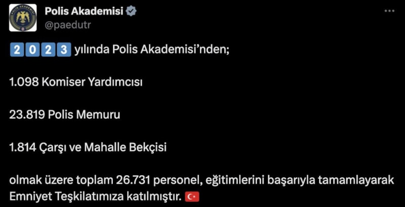 Polis Akademisi Başkanlığı'nın sosyal medya hesabından 2023 yılına ilişkin paylaşım yapıldı.