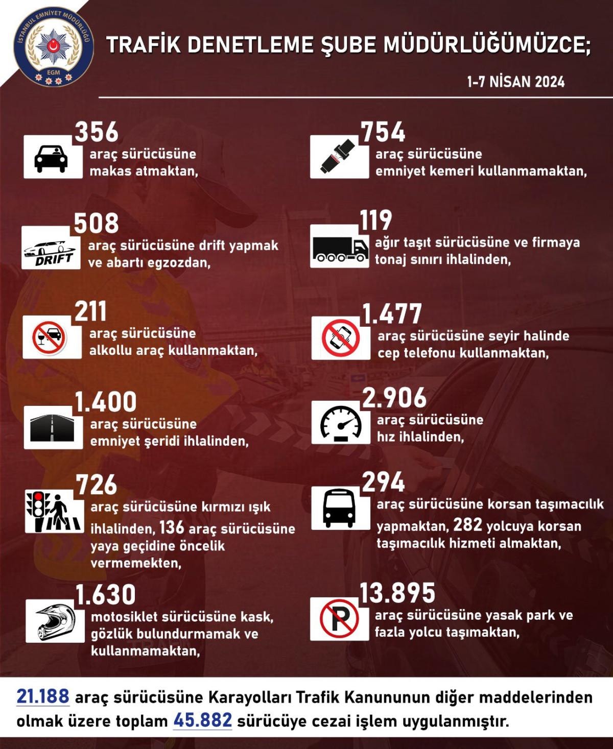 İstanbul İl Emniyet Müdürlüğü, Trafik Denetleme Şube Müdürlüğü tarafından 1-7 Nisan 2024 tarihleri arasında trafik uygulaması gerçekleştirildi.