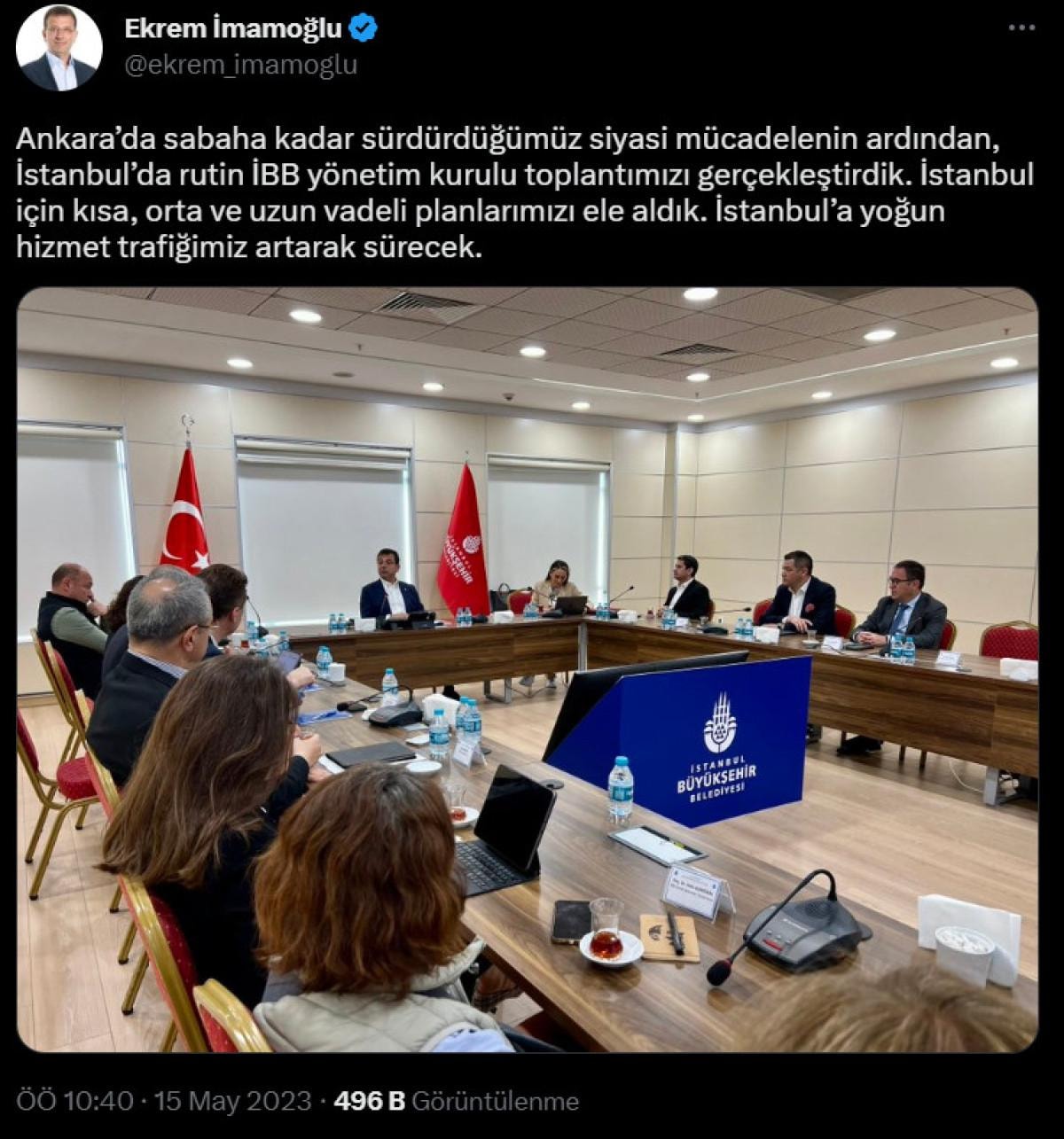 İstanbul'a dönen İmamoğlu payalştığı tweet'te; "Ankara’da sabaha kadar sürdürdüğümüz siyasi mücadelenin ardından, İstanbul’da rutin İBB yönetim kurulu toplantımızı gerçekleştirdik.
