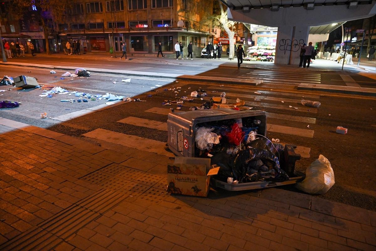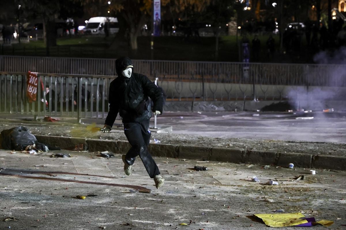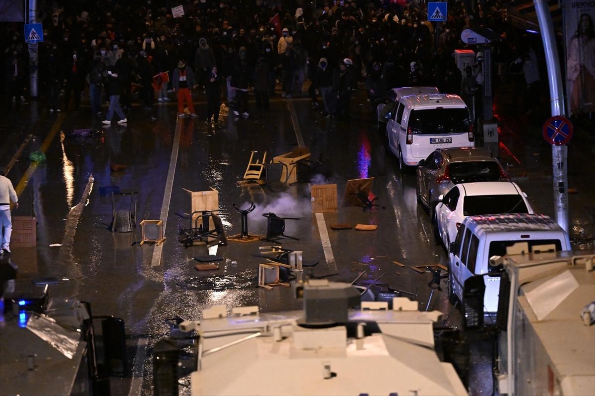 Burada yüzlerini maskeyle gizleyen bazı kişiler civardaki iş yerlerinden aldıkları masa ve sandalyeleri polise fırlattı.