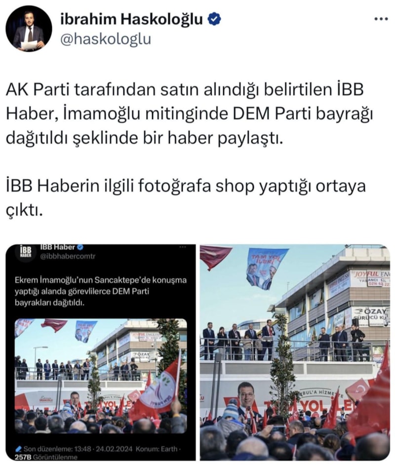 Ekrem İmamoğlu'na yakınlığıyla bilinen isimler, DEM Parti bayraklarının montaj olduğunu ve Photoshop ile bayrağın fotoğrafa konulduğunu öne sürdü.