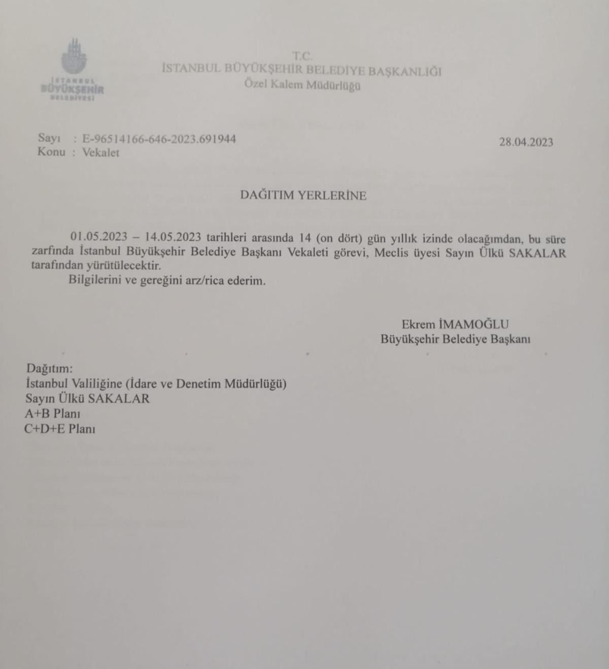 “01.05.2023 – 14.05.2023 tarihleri arasında 14 (on dört) gün yıllık izinde olacağımdan, bu süre zarfında İstanbul Büyükşehir Belediye Başkanı Vekaleti görevi, Meclis üyesi Sayın Ülkü SAKALAR tarafından yürütülecektir. Bilgilerini ve gereğini arz/rica ederim.”