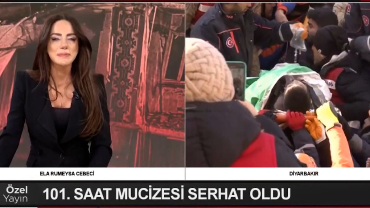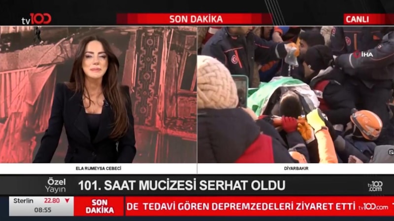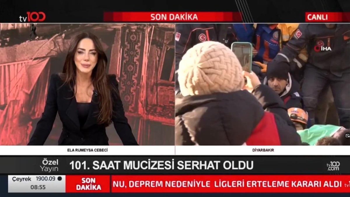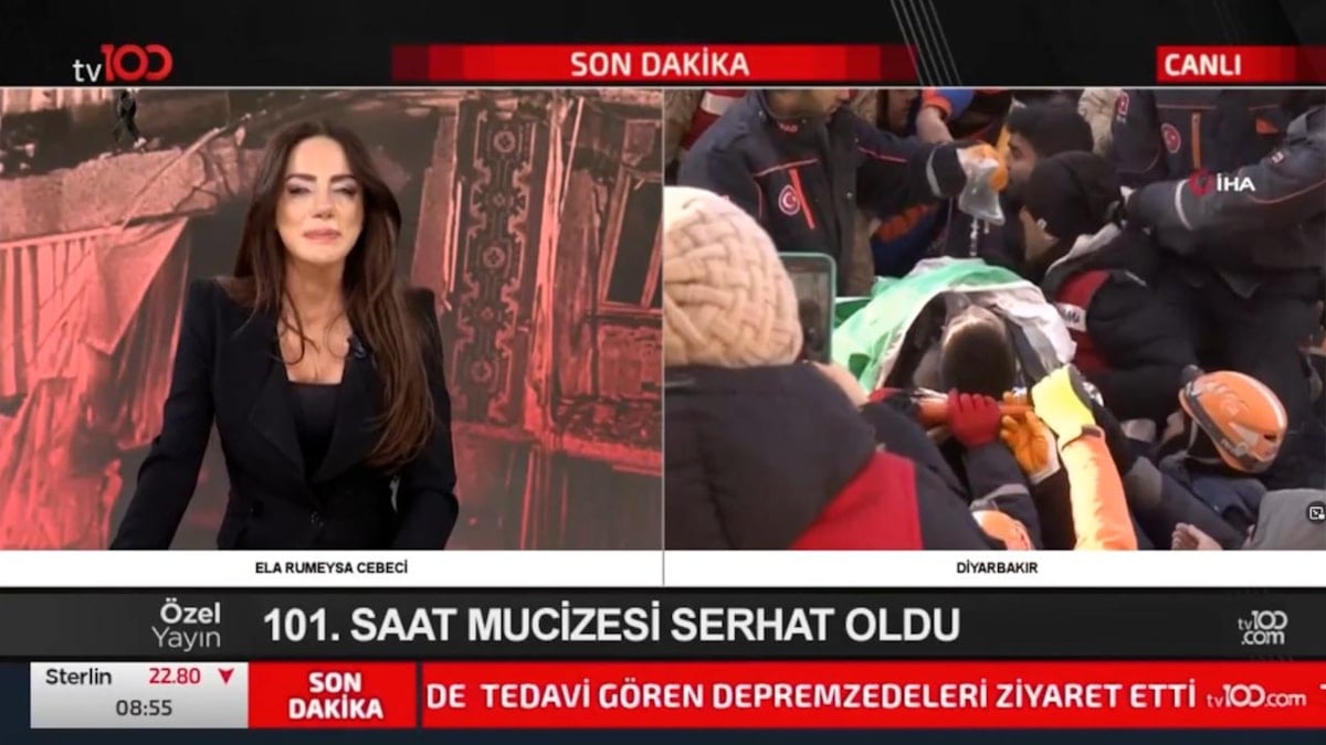 O anlar TV 100 ekranlarında gösterilirken, deprem özel yayınının sunucusu Ela Rümeysa Cebeci, gözyaşlarına boğuldu.