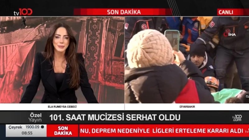 Diyarbakır'da enkaz altından saatler sonra çıkarılan depremzedeyi anlatırken ağlayan TV 100 sunucusu Ela Rümeysa Cebeci, "Düzce depreminde babaannemi kaybetmiştim" diyerek ağladı.