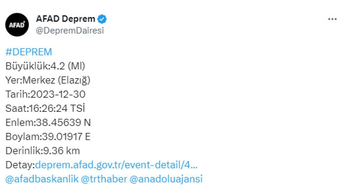 Afet ve Acil Durum Yönetimi Başkanlığı (AFAD) Elazığ'daki depremi duyurdu.