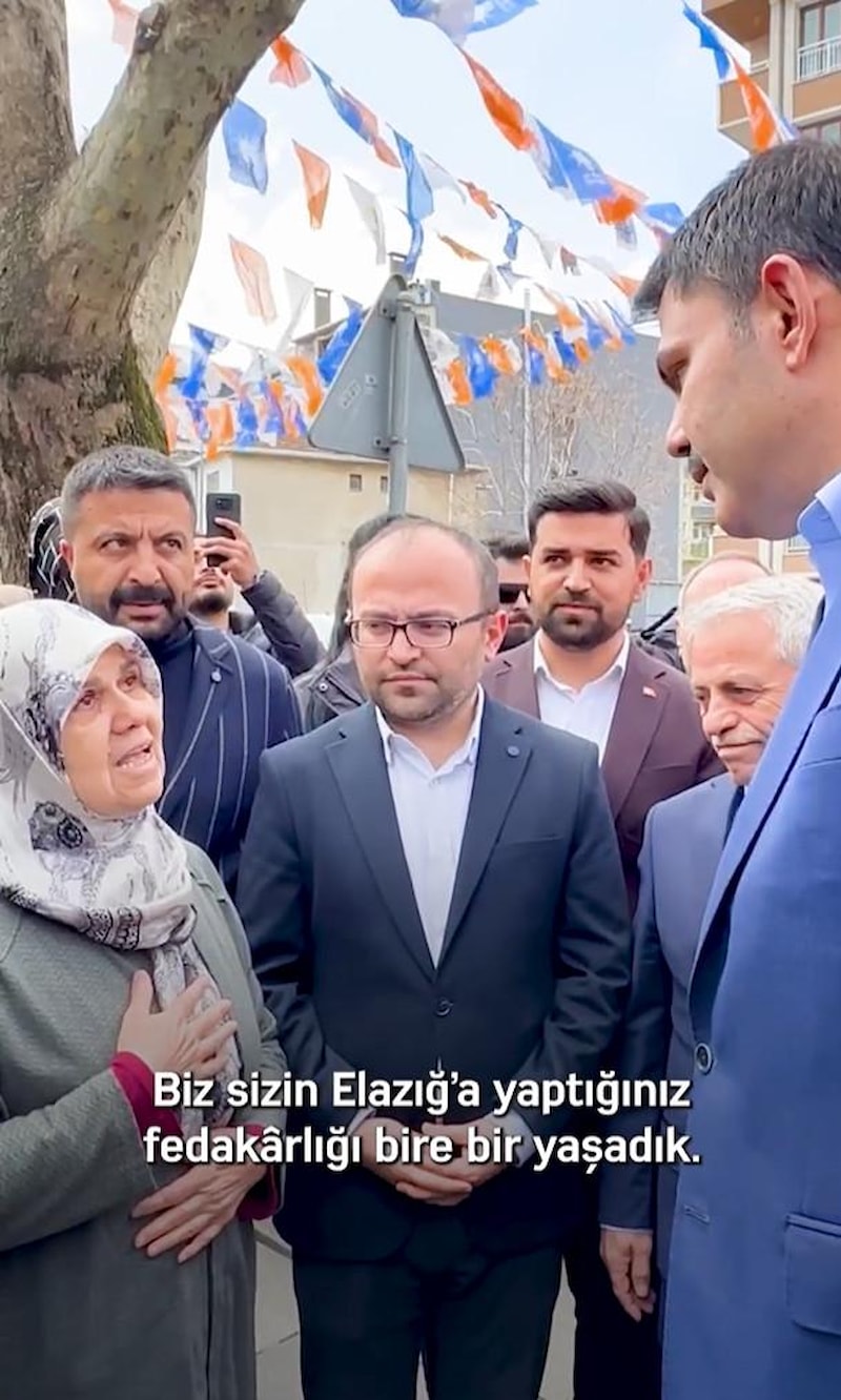 Çevre, Şehircilik ve İklim Değişikliği Bakanı Kurum, 14 Mayıs seçimleri için yürüttüğü saha çalışmalarında Elazığlı depremzede ile karşılaştı. Burada Bakan Kurum'a övgüler yağdıran kadın, "Çok mücadele ettiniz, Rabbim sizin yar ve yardımcınız olsun." dedi.