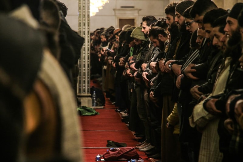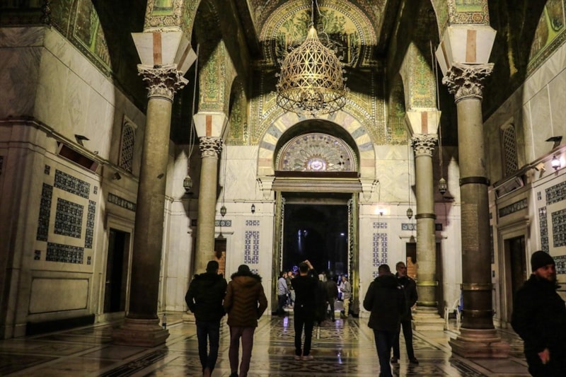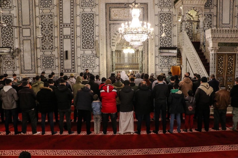 Tarihi Emevi Camii’nde teravih namazı için toplanan Suriyeliler, 50 yıl sonra ilk kez Esad ve ailesi için dua etmeden teravih namazlarını kıldı.
