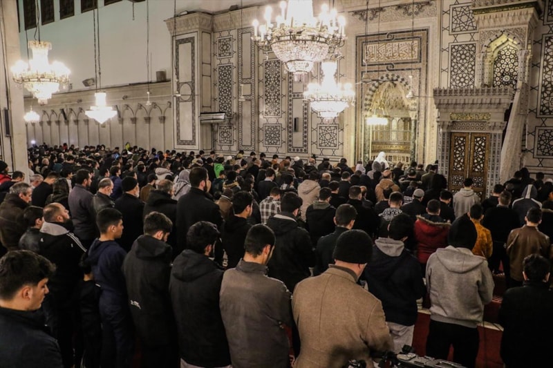 Suriye’nin başkenti Şam’daki tarihi Emevi Camii, teravih namazında cemaatle dolup taştı.