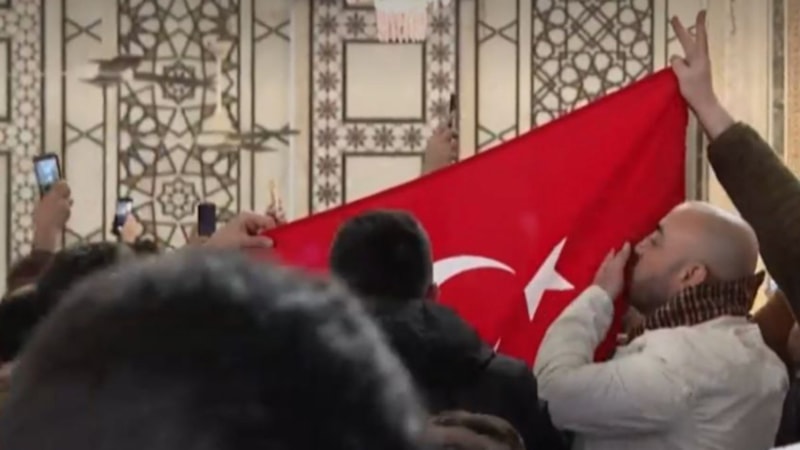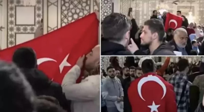 Emevi Camii'nde kılınan ilk cuma namazının ardından cami içerisinde bulunan Suriyeli vatandaşlar, Türk bayrağı açtı ve Türk halkına teşekkürlerini yolladı.