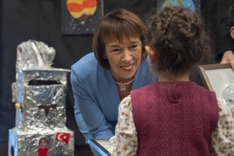 Çocukların, "kodlama" dersi kapsamında yaptıkları basit elektrik devresi çalışmalarını ve gezegen şeklindeki gece lambası tasarımlarını inceleyen lider eşleri, çocuklarla etkinliklerine ilişkin sohbet etti.