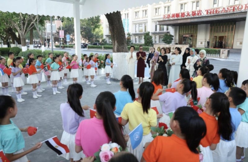 Emine Erdoğan, program alanında Çin Devlet Başkanı Şi'nin eşi Pıng Liyüen tarafından samimiyetle karşılandı.