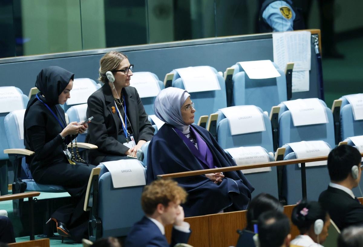 Eşi Emine Erdoğan da Türkevi'nden birlikte yürüyerek geçtikleri BM Genel Merkezi'nde Cumhurbaşkanı Erdoğan'ın, BM'nin 80. Genel Kurulu'nda yaptığı konuşmayı salonda dinledi.