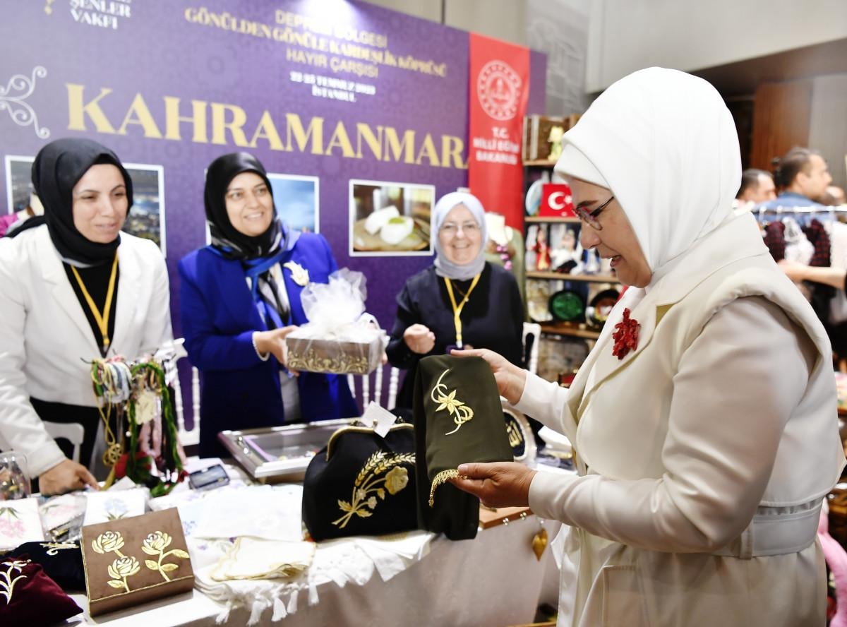 Cumhurbaşkanı Recep Tayyip Erdoğan'ın eşi Emine Erdoğan, onursal başkanlığını yaptığı Şule Yüksel Şenler Vakfı tarafından gerçekleştirilen “Deprem Bölgesi Gönülden Gönüle Kardeşlik Sofraları Hayır Çarşısı” programına katıldı.
