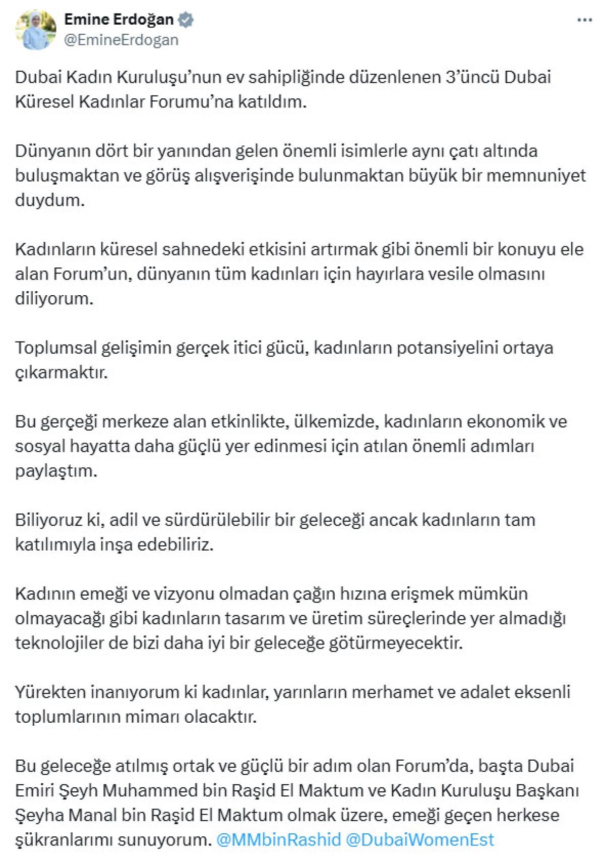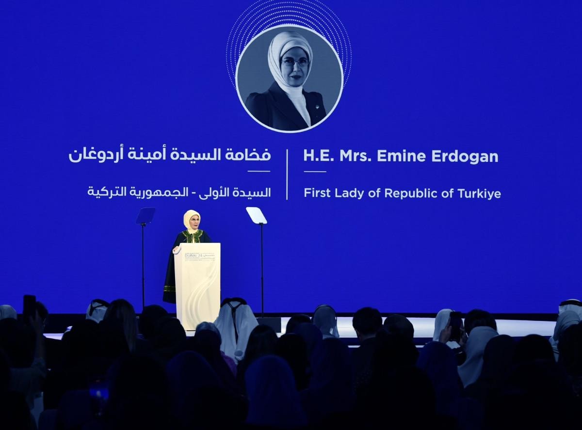 Emine Erdoğan, kadının emeği ve vizyonu olmadan çağın hızına erişmenin mümkün olmayacağını vurgulayarak, "Geleceğe atılmış ortak ve güçlü bir adım olan Forum'da, başta Dubai Emiri Şeyh Muhammed bin Raşid El Maktum ve Kadın Kuruluşu Başkanı Şeyha Manal bin Raşid El Maktum olmak üzere, emeği geçen herkese şükranlarımı sunuyorum." ifadesini kullandı.