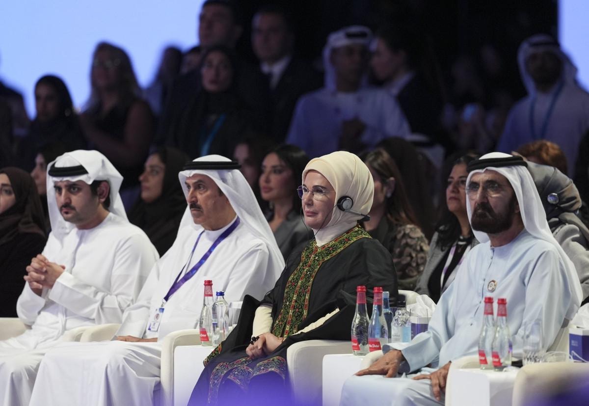 Emine Erdoğan, konuşmasını dinleyen Dubai Emiri, Şeyh Muhammed bin Raşid Al Maktum ve Kadın Kuruluşu Başkanı Şeyha Manal bin Raşid Al Maktum ve Dubai Kültür ve Sanat Kurumu Başkanı ve Dubai Yürütme Konseyi Üyesi Latifa bint Mohammed bin Rashid Al Maktum ile salona girişinde sohbet etti.
