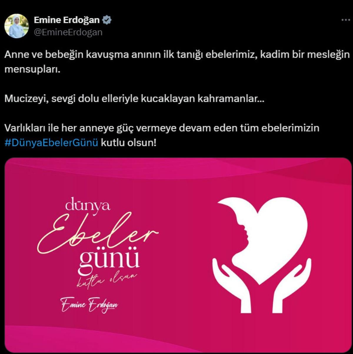 Bu kapsamda Cumhurbaşkanı Recep Tayyip Erdoğan'ın eşi Emine Erdoğan, sosyal medya hesabından Dünya Ebeler Günü'ne ilişkin paylaşımda bulundu.