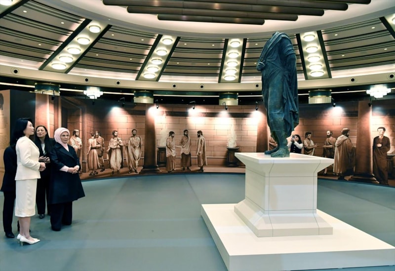 Cumhuriyet tarihinin en kapsamlı arkeoloji projesi 'Geleceğe Miras' kapsamında yapılan kazılarla bulunan eserlerin yer aldığı 'Arkeolojinin Altın Çağı Sergisi'ni de gezen Emine Erdoğan ve Kim, Roma İmparatoru Marcus Aurelius'un bronz heykelin de yer aldığı sergideki eserleri yakından inceledi.