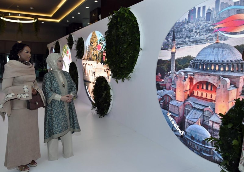 Daha sonra Emine Erdoğan ve misafirleri, Milli Eğitim Bakanlığı Hayat Boyu Öğrenme Genel Müdürlüğüne bağlı Antalya Olgunlaşma Enstitüsünce hazırlanan Türkiye'nin kültürel çeşitliliğini ve el sanatlarını yansıtan özgün tasarımlardan oluşan dokuma el sanatları sergisini gezdi.