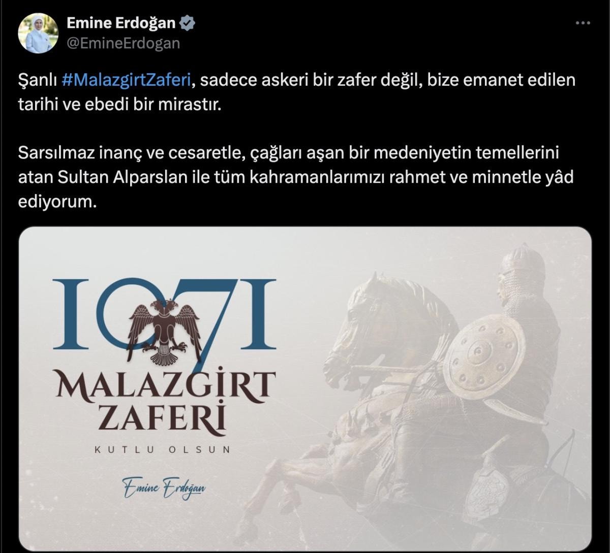 "Şanlı Malazgirt Zaferi, sadece askeri bir zafer değil, bize emanet edilen tarihi ve ebedi bir mirastır. Sarsılmaz inanç ve cesaretle, çağları aşan bir medeniyetin temellerini atan Sultan Alparslan ile tüm kahramanlarımızı rahmet ve minnetle yad ediyorum."